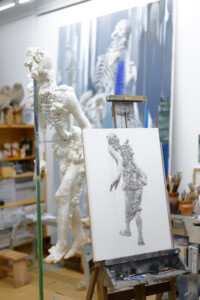 静物画のプロジェクトを休止した後、彼が作り上げたのが、本展のメイン作品である《汀にて》(2025年)です。宮本氏がアトリエを訪れると、骨格標本に少しずつ手足が肉付けされ、徐々に人間の形になりつつあるモチーフが出現していたと言います。