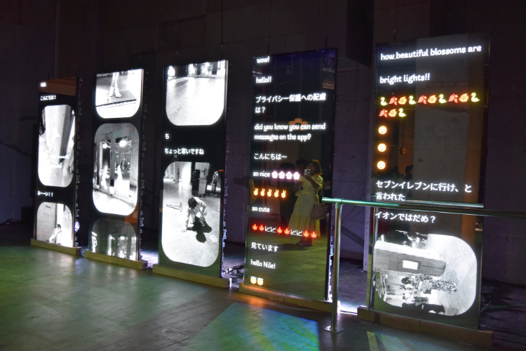 「ブルーム」のやりとりは、会場のモニターに時折映し出され、鑑賞者が「自身も作品に参加している」と実感し、人々とのつながりを意識することができます。