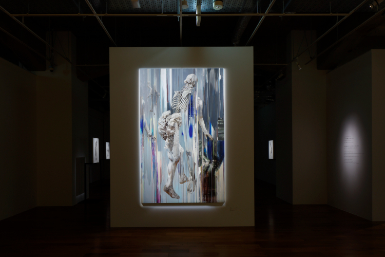 正面に立つ女性が、頭蓋骨の目の向こうからこちら側を見ている作品や、キリンの頭部の骨格があらわになった絵画など、諏訪氏の代表作がひとつの部屋に集結しています。