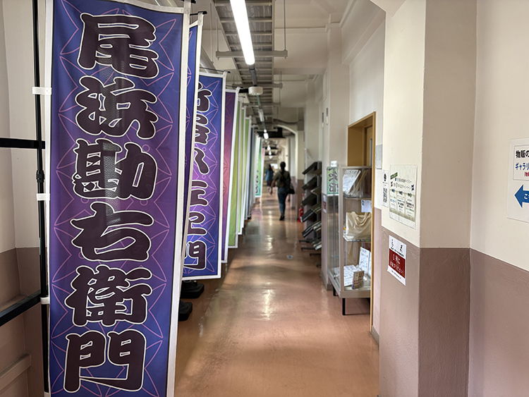 庁舎に入ると、ギャラリー前の廊下にはキャクター名が書かれたのぼりがずらりと並んでいます。