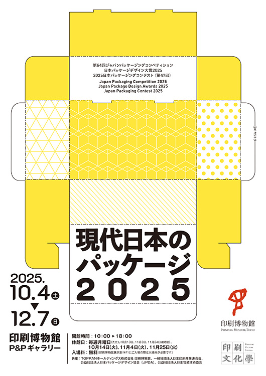 ※地下展示室を入場する場合は入場料が必要デザインを学ぶみなさんにオススメする展覧会は、3つのパッケージコンクールで受賞した作品を一堂に集めた展覧会「現代日本のパッケージ2025」です。普段よく目にする家庭の包装から、あまり見ることのない輸送用の包装まで展示されています。さて、展示のチラシを見て、ピン!ときた方もいらっしゃるのではないでしょうか。チラシの展開図を切り抜くと、実際にパッケージを作ることができる仕掛けになっています!ぜひ、チラシを持ち帰って組み立ててみてください。また、この仕掛け以外にも、開館25周年を記念して11月2日(日)までチケットカウンターでユニークな「25」を見せると、地下展示室の入場料が無料になる企画を行っています。みなさんならではの「25」を持って印刷博物館に行ってみてくださいね。(2025年と書かれたものは無料にならないそうです)