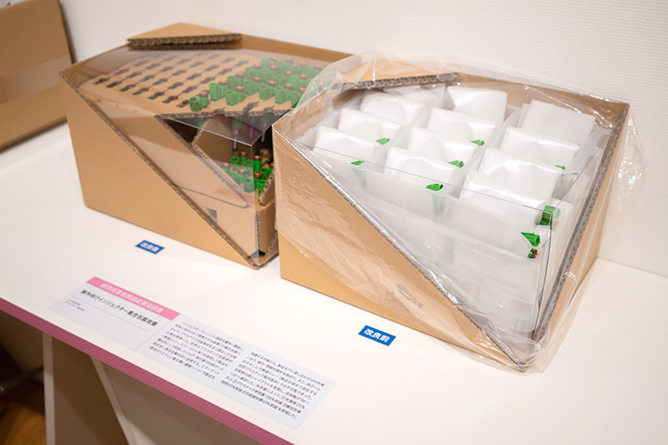 車に乗られている方でなければ中々馴染みの無い商品ではありますが、インジェクターという部品を発送するパッケージです。従来であれば、右の展示のように、ひとつひとつの部品を包み、更にプラケースに収容したものをスタッキングしていました。新しい仕様は、段ボール固定材にインジェクターを縦向きに収容する事で、プラスチック使用量を100%削減し、レイアウトを変更した事で、収容数も96個から120個まで増え、包む必要がなくなった事で、梱包作業時間も65%削減する事に成功したんです。我々の知らないところで、こういう工夫がされる事によって、環境に優しく、働く人にとっても効率化を実現している。まさにJPIらしい受賞作品だと思います。