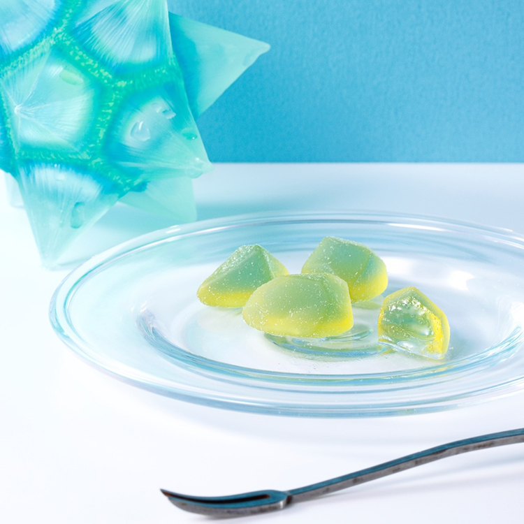 『空想果実』はデザイン会社と共創して生まれた商品です。<グミで何か面白いことはできないか>という考えで色々生まれた案の中の一つが『空想果実』でした。グミは味・形ともに自由なお菓子だと思うので『空想果実』と親和性があると考えました。このシリーズで最初に生まれた果実の「キラスピカの実」はゼロからの構築だったので試行錯誤の連続でした。「キラスピカ」っぽい味って何だろうと想像している味を伝えることから始まり、デザイン会社の方や研究員の方、造形作家さんなど、みんなでお互いに上手くイメージを汲み取りながら試作を重ねて実現していきました。