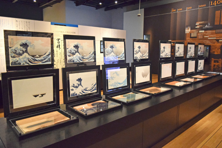 浮世絵が完成するまでのプロセスを解説するコーナー。一色ずつ版をつくって印刷されていることが分かります。