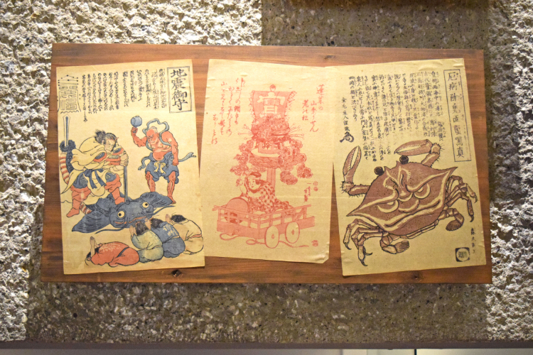 地震の御守りとして刷られた「鯰絵(なまずえ)」(写真左、レプリカ)。当時は、なまずが地震を起こすと信じられており、木版の御守りが人々の間で人気となりました。