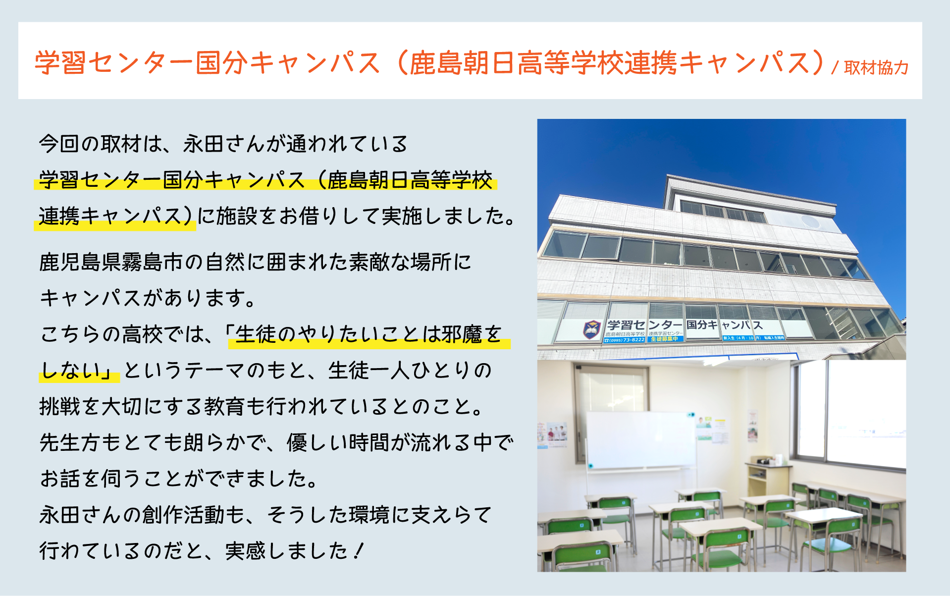 今回は、永田さんが学ばれている鹿児島県霧島市にある、学習センター国分キャンパス(鹿島朝日高等学校連携キャンパス)にご協力をいただき、校内にてインタビューを行わせていただきました。