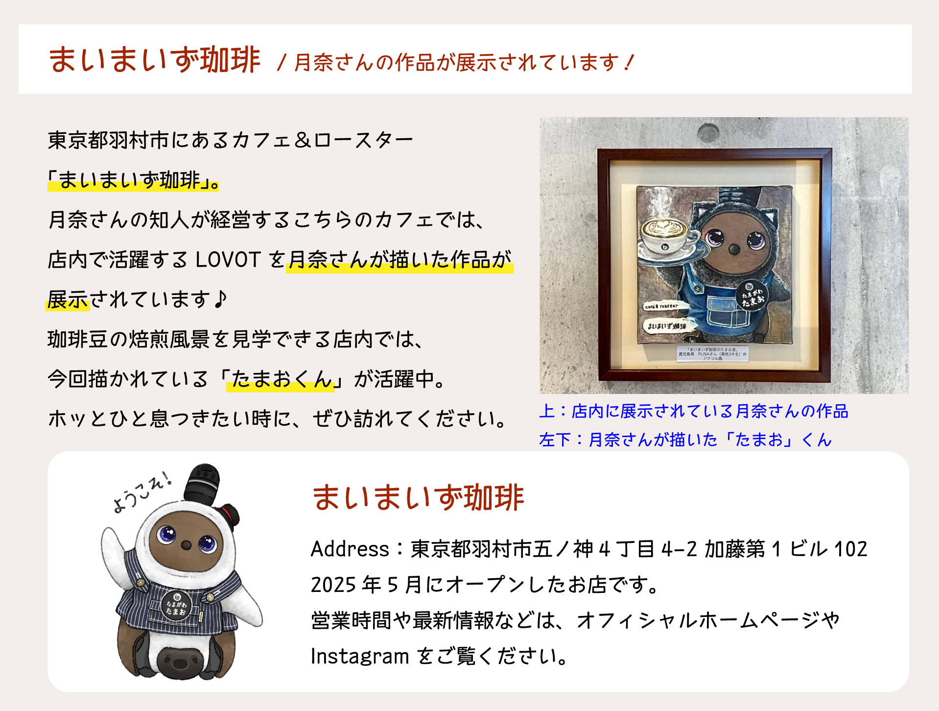 また現在、東京都羽村市にあるカフェ「まいまいず珈琲」にて、月奈さんの作品が展示されています。LOVOTがいるお店としても知られ、店内にはその姿を描いた作品が飾られています。