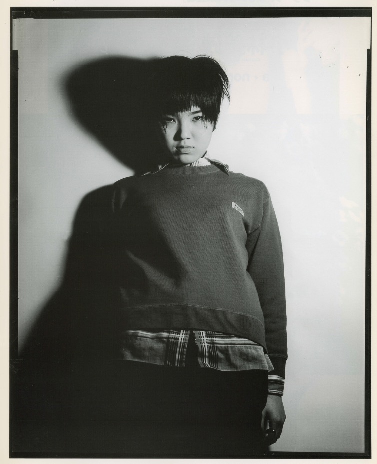 屋外にホリゾントとして白のバックペーパーをセットし、発電機を使いランプをモデルに当て、8×10のカメラを使いモノクロで撮る。