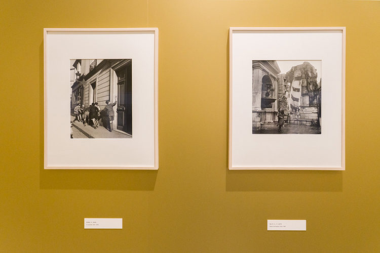 会場は、L字型の壁面で区切られており、ドアノーが撮影した作品が展示されていました。ドアノーの作品は「特別な何か」ではなく、フランスの日常の中にある風景、群衆の中にある小さな出来事を切り取ったもの。しかし、完全なるスナップではなく、いわゆる〝作り〟で必要に応じて演出も使っていたのは有名ですね。「パリ市庁舎前のキス」もその一つです。